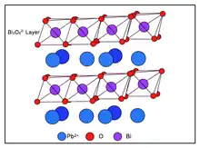 Lead bismuthate is a superconductor with the formula Pb(BiO3)2. has only been discovered in recent years in the laboratory as it is not naturally occurring. Lead bismuthate forms a pentavalent structure, significantly different from the regular ionic interactions of sodium bismuthate, but similar to that of strontium bismuthate.[1] In the structure, six oxygen atoms are coordinated octahedrally to both the bismuth and lead atoms. The bismuth and oxygen atoms form negatively charged layers by creating repeating octahedral geometries. The positively charged lead atoms are then disbursed within the layers, forming a hexagonal unit cell, with a lead atom in each of the corners. The density of the crystal is 9.18 g/cm3. The formula weight is 233.99 g/mol.[1] The volume of the crystal structure unit is 169.26 A3. Lattice parameters (a) is 5.321 angstroms.
