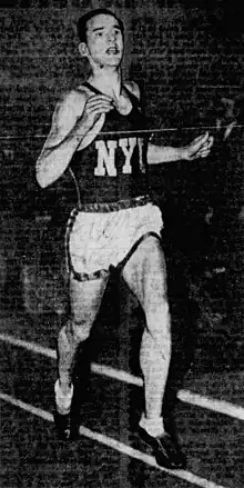 In 1939 and 1940, MacMitchell won the IC4A cross country championship.[2] By the early 1940s, MacMitchell had gained a reputation as a leading American runner, particularly in the mile.[1][3] One writer predicted that MacMitchell would be the first man to accomplish a four-minute mile, and that he would later "be hailed as the greatest runner of all time".[1] At the 1941 Baxter Mile, he ran the mile in 4:07.4 seconds, tying the world indoor record held by Glenn Cunningham and Chuck Fenske.[1] In the meets held at Madison Square Garden that year, MacMitchell was undefeated in the mile in five races.[1] In 1941, he also won the National Collegiate Athletic Association (NCAA) outdoor mile national championship, along with outdoor and indoor IC4A victories. MacMitchell was the Amateur Athletic Union's (AAU) champion of the 1500 meters, and won every cross country event he entered, the fourth consecutive year he did so.[4] He won his third consecutive Intercollegiate cross country title, on top of a 1938 victory in the championship for freshmen.[5] In December 1941, MacMitchell was announced to be the leading vote-getter for the James E. Sullivan Award;[4] this made him the first winner of the award not to have graduated from college,[3] as he was in his senior year at NYU at the time. He was the youngest recipient of the Sullivan Award at the time, and was the first winner from New York state.[4]