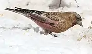 The ancestor of the three species of North American rosy finches migrated from Asia.[11] All rosy finches live in an alpine or tundra environment. The gray-crowned rosy finch has a wide range[12] and large numbers throughout Alaska, and western Canada and the United States. L. t. griseonucha permanently resides in the Aleutian Islands and umbrina on the Pribilof Islands. A small number of gray-crowned rosy finches winters on the mainland in South-Central Alaska and visits feeders there. The other taxa: littoralis, tephrocotis, wallowa, and dawsoni are found from the Canadian and American Rockies and migrate south to the western United States.[1] L. t. tephrocotis summers from Montana to the Yukon, while littoralis breeds closer to the coast, from northern California to west-central Alaska.[5] Due to its remote habitat, few of its nests have been found, it is rarely spotted, and the population is stable.[3][9] They are invariably found amongst rocks.[9] The areas the subspecies breed in rarely overlap during breeding season. Males typically outnumber females throughout the year.[6] An individual was seen north of Boonville, in Lewis County, NY beginning on Sunday, March 4 through at least Thursday, March 8. This is only the second confirmed report for New York State.[13]