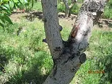 The most striking symptom of infection includes cankers located on the main trunk, branch crotches, scaffold limbs, and older branches.[3] A symptom called “flagging” can be found on necrotic scaffold limbs. The cankers are parallel to the long axis of the stem and take on an oval shape. Normally, large-scale production of amber colored gum marks the first external symptom of such cankers. While gum production is the typical plant response to irritation, the gum secretion of Leucostoma occurs in bulk amounts. This gum darkens as time passes, gradually leading to the drying and cracking of bark; thus exposing the blackened tissue below.