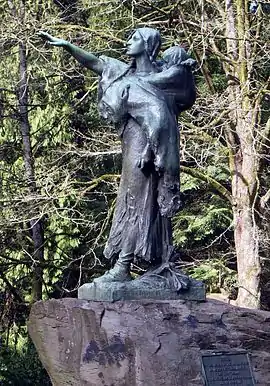 Despite the relative failure of the coin issue, the statue of Sacagawea was duly erected in a Portland park, financed by coin sales.[1] In 2000, Sacagawea joined Lewis and Clark in appearing on a gold-colored dollar coin, with the issuance of a circulating coin depicting her and her son.[23]