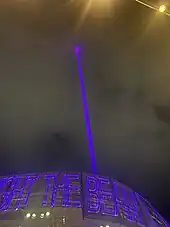 Speaking to NBC Sports California, Ranadivé recalled a conversation with David Kelley, in which Kelley told him "Look, you've got to figure out what your purple lights are."[3] Asking for clarification, Kelley elaborated "Well, if you ever go on Virgin [Airlines], you step on the plane and you sit down and you see these purple lights. You immediately know that this is going to be different from any other experience you've ever had on any other airline. It's going to be unique, it's going to be special, and you look forward to it."[3] Officially called the "Laser Space Cannon", the beam has been credited to Tim Anderson, owner and founder of Nu-Salt Laser International.[8] The beam is powered in the form of 1,000 watts of RGB laser power, being noted to be the brightest full-color laser equipment in the world.[3][5] Originally powered by four lasers,[9] Ranadivé was asked to add more lasers to make the beam brighter.[5] Once updated, six lasers used 1,800 watts of total power for the beam.[10]