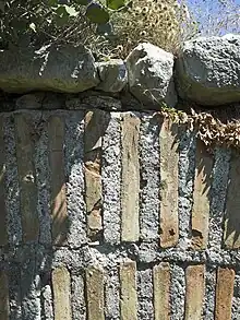 The bricks of the segmental arches are made of yellow-red clay, mixed with fine brick fragments. The bricks are rectangular plates, measuring ca. 40 cm × 50 cm (15.7 in × 19.7 in) and 5 cm (2.0 in) thick. They are placed with the shorter side upright facing outwards, so that the total thickness of the arches measures ca. 80 cm.[12] The bricks are bound with grout of lime mortar mixed with brick shards and fine gravel, forming 4 cm (1.6 in)-thick joints. The two later semi-circular arches were built with smaller bricks, although surviving bricks from the original arch were re-used at places.[12] The abutment stones are dressed limestone ashlar blocks, and form a sloping surface to support the arches.