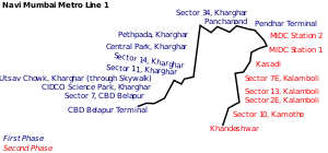 Line 1 is being developed in 3 phases. Phase I is an 11.1 km (6.9 mi) section from Belapur to Pendhar with 11 stations.[4] In the second phase, an 8.15-kilometre (5.06 mi) line will be built from Khandeshwar to Taloje MIDC, with seven stations. The third phase will entail the merging of two rail corridors between Pendhar and MIDC with a 2.2-kilometre (1.4 mi) link, forming a loop from Belapur to Khandeshwar.[10][11]