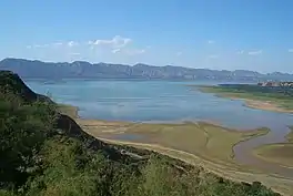 The Liujiaxia Reservoir (simplified Chinese: 刘家峡水库; traditional Chinese: 劉家峽水庫; pinyin: Liújiāxiá Shuǐkù) is a reservoir in China's Gansu Province, formed by the Liujiaxia Dam on the Yellow River. It occupies over 130 km2 (50 sq mi),[1] and is located entirely within Linxia Hui Autonomous Prefecture. The reservoir's shores belong to the prefecture's Yongjing County (the narrow northern part, and the north shore of the wide southern part), Dongxiang Autonomous County (eastern part of the south shore), Linxia County (western part of the south shore), and Jishishan Bonan, Dongxiang and Salar Autonomous County (the small westernmost section of the south shore).