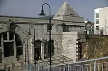 The entrance is at the top of a wide flight of steps leading up from Hope Street. Above the entrance is a large wedge-shaped structure. This acts as a bell tower, the four bells being mounted in rectangular orifices towards the top of the tower. Below these is a geometric relief sculpture, designed by William Mitchell, which includes three crosses. To the sides of the entrance doors are more reliefs in fibreglass by Mitchell, which represent the symbols of the Evangelists.[21][23] The steps which lead up to the cathedral were only completed in 2003, when a building which obstructed the stairway path was acquired and demolished by developers.[24]