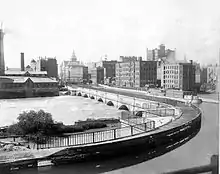After Montezuma Marsh, the next difficulties were crossing Irondequoit Creek and the Genesee River near Rochester. The former ultimately required building the 1,320-foot (400 m) long "Great Embankment", to carry the canal at a height of 76 feet (23 m) above the level of the creek, which ran through a 245-foot (75 m) culvert underneath.[23] The canal crossed the river on a stone aqueduct, 802 feet (244 m) long and 17 feet (5.2 m) wide, supported by 11 arches.[24]