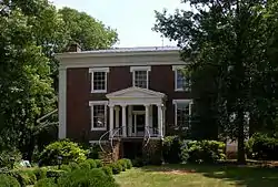 Lone Oaks, also known as the Benjamin Deyerle Place and Winsmere, is a Greek Revival mansion listed on both the National Register of Historic Places and the Virginia Landmarks Register in the Greater Deyerle neighborhood of the independent city of Roanoke, Virginia. Located at 3402 Grandin Road Extension SW, Lone Oaks was completed in 1850 as the private residence of Benjamin Deyerle overlooking Mudlick Creek.[3][4] Today the home still stands, with the surrounding area now developed as single family home typical of those built during the 1970s–1980s.[4] Today the home remains as a private residence.[5] The house is L-shaped with a single pediment Doric entrance portico, which has plain square pillars and fluted columns. It became a Virginia Historic Landmark and was listed on the National Register of Historic Places in 1973.