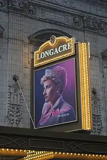 Productions in the early 2010s included La Cage aux Folles in 2010, Chinglish in 2011, Magic/Bird and The Performers in 2012, First Date the Musical in 2013, and Of Mice and Men and You Can't Take It with You in 2014. This was followed by the musicals Allegiance in 2015, A Bronx Tale in 2016, The Prom in 2018, and The Lightning Thief in 2019.[16][22] A Bronx Tale achieved the box office record for the theater, grossing $1,293,125.32 over nine performances for the week ending January 1, 2017.[254] During the run of The Prom, in 2019, Broadway's first known onstage wedding happened at the Longacre between two women.[255][256] On March 12, 2020, the theater closed due to the COVID-19 pandemic.[257] It reopened on November 2, 2021, with previews of Diana,[258] which ran seven weeks.[259] A limited revival of the play Macbeth opened in April 2022,[260][261] followed by the play Leopoldstadt in October 2022.[262][263] The Broadway transfer of the musical Lempicka, based on the life of Tamara de Lempicka, will open at the theater on April 14, 2024.[264][265]