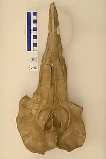 The phylogenetic analysis of Brujadelphis recovered Lophocetus as polyphyletic, with L. calvertensis and L. repenningi forming a clade with taxa assigned to Pithanodelphininae and Tagicetus, and L. pappus falling as the sister taxon of Lipotidae.[4] If "Lophocetus" pappus is a relative of the baiji, it would fill a gap in the early evolutionary history of the baiji because the oldest unambiguous extinct relative of the baiji, Parapontoporia, hails from younger marine deposits. However, a strict consensus phylogenetic analysis of the pontoporiid Scaldiporia recovers "Lophocetus" pappus outside the clade formed by Inioidea+Lipotidae and Delphinoidea, while recovering Lophocetus as a relative of beaked whales and Squaloziphius.[5]