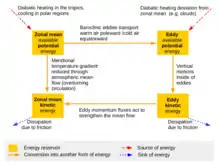 The description of the Lorenz Energy Cycle is completed by a mathematical formalism for the generation of potential energy through diabatic heating, its conversion to kinetic energy through vertical motion of air and the dissipation of kinetic energy through friction. A conversion of zonal-mean energy to eddy energy and vice versa is possible where eddies interact with the mean flow and displace warm/cold air.[1]