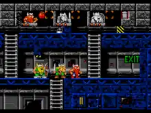 The Lost Vikings is a side-scrolling platform adventure in which the player alternates control of the three Viking characters, guiding each of them one at a time (though control may be swapped from character to character at any point) from a designated start point in each level to the exit. Mega Drive/Genesis version of the game offers a two-player cooperative mode in which each player simultaneously controls one Viking and is allowed to change control to the third, unused Viking at any point. Every level is designed such that each Viking must contribute his unique skills to help the other two through to the end. Similarly, to finish the level, all three characters must reach the exit point. Every Viking has three health points that can be lost by getting hurt by enemies or by falling from great heights. Should any Viking run out of health points, he dies; gameplay will then continue with any remaining Vikings, but the level becomes unwinnable, and the player will eventually have to restart the level and try again. However, the game offers unlimited continues.