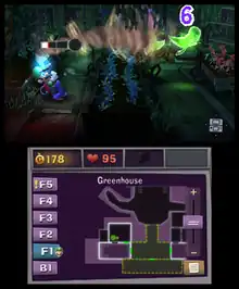 Exploration through a mansion is divided into multiple mission-based levels that focus on completing a number of objectives, such as retrieving an object, accessing a particular room, or defeating a stronger boss ghost.[3] At the end of each mission, the player is scored based on various factors such as the treasures and ghosts collected. If Luigi takes too much damage from ghost attacks or environmental hazards and loses all his heart points, he will faint and the player must restart the mission. If the player finds and collects a golden bone, Luigi will be revived and continue the mission instead of starting over. The Nintendo 3DS touchscreen shows a mini-map of the mansion's layout, with locations of both locked and unlocked doors. The character Toad accompanies Luigi in certain missions. When the player obtains the Dark Moon fragment hidden in a mansion, they can progress to the next mansion.[3]