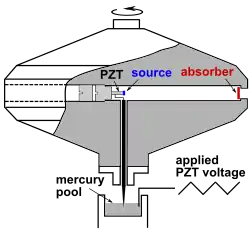 A more precise confirmation of the relativistic Doppler effect was achieved by the Mössbauer rotor experiments. From a source in the middle of a rotating disk, gamma rays are sent to an absorber at the rim (in some variations this scheme was reversed), and a stationary counter was placed beyond the absorber. According to relativity, the characteristic resonance absorption frequency of the moving absorber at the rim should decrease due to time dilation, so the transmission of gamma rays through the absorber increases, which is subsequently measured by the stationary counter beyond the absorber. This effect was actually observed using the Mössbauer effect. The maximal deviation from time dilation was 10−5, thus the precision was much higher than that (10−2) of the Ives–Stilwell experiments. Such experiments were performed by Hay et al. (1960),[13] Champeney et al. (1963, 1965),[14][15] and Kündig (1963).[16]