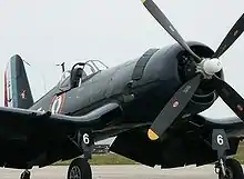 Twin M3 barrels poking out from the leading edges of the wings of a French Navy Corsair.