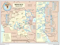 The initial UN presence in the Democratic Republic of the Congo, before the passing of United Nations Security Council Resolution (UNSCR) 1291, was a force of military observers to observe and report on the compliance on factions with the peace accords, a deployment authorised by the earlier UNSCR 1258 (1999).[3] UNSCR 2556 (2020) provides the authority for the current MONUSCO mandate.[4][5]