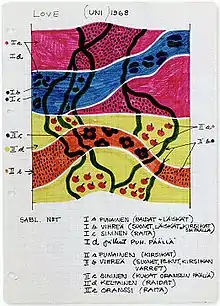 From 1965 to 1967, Isola worked on the theme of sun and sea, creating at least nine designs that were adopted by Marimekko, including Albatrossi (Albatross), Meduusa (Jellyfish), and Osteri (Oyster).[19] Her patterns were, by now, being widely reproduced. To facilitate this process and to keep the patterns accurate, Isola maintained a set of "pattern books". These were handwritten exercise books containing precise details of her pattern repeats. Each one, such as her 1968 Lovelovelove, was drawn to scale on a pattern book page, coloured, and annotated with the names of the colours to be used. The books also recorded the size of the actual repeat and details of print orders. The books continued to be used as production guides in the decades after her death.[14]