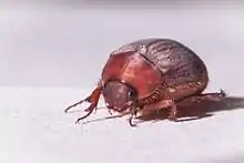 The species was originally first described from India in 1894. It was dispersed to Iran in the 1960s, while it reached Israel in the 1980s. It is believed that a number of specimens arrived on shipments of pistachios and oil that were brought from Iran. Unaware that this beetle was already well-known elsewhere, an Israeli researcher mistakenly renamed it Maladera matrida, the new scientific name reflecting the nuisance it brings: "matrida" "מטרידה" means "bothersome" in Hebrew.[1] Due to its Iranian origin and brown color ("חום khoom" in Hebrew), it is colloquially named 'Khomeini' after Iranian politician Ruhollah Khomeini, spiritual leader of Iran at the time the insect began spreading in Israel.[2] This invasive species is distributed in the Arabian peninsula and northern Africa as well.