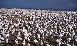 Most of the central part of the island is occupied by the Cape gannet colony, one of only six in the world, and which, with some 20,000 breeding pairs, holds 25% of the world population.[2] Other breeding seabirds include bank and Cape cormorants, kelp and Hartlaub's gulls, and African penguins. African black oystercatchers are also resident.[1] The island forms part of the West Coast National Park and Saldanha Bay Islands Important Bird Area, identified as such by BirdLife International.[2] Therefore, only select researchers will be allowed to go ashore. The Cape gannets have been studied intensely, and their breeding success is watched over by Honorary Rangers.