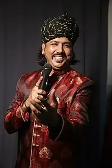 He was also a part of Shankar Mahadevan's folk project titled My Country, My Music.[3] He was the lead vocalist of Roysten Abel's show, The Manganiyar Seduction,[20] which has been touring the world since 2006.[21] He has performed at some of India's most popular festivals including the NH7 Weekender,[22] Mood Indigo,[23] Repertwahr Festival,[24] Rajasthan Partnership Summit[25] and Sahitya Aaj Tak.[26] In June 2018, he performed with his troupe at the Mumbai's National Centre for the Performing Arts (NCPA), where he also collaborated with Kaushiki Chakraborty.[27] First folk singer to play the opening act at NMACC's Studio Theatre in 2023.