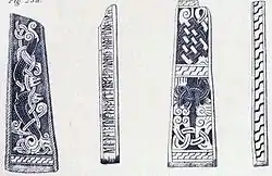 The Manx runestones are consequently similar to the Scandinavian ones,[2] but whereas a Norwegian runestone is called "stone" in the inscriptions, even if it is in the shape of a cross, the runestones that were raised in the British isles are typically called "crosses".[3] There are also two slabs incised with Anglo-Saxon runes at Maughold.[4]