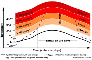 22. 1 2 3 4 5 6 7 8 9 10 11 12 13 14 15 16 17 CSIRO; Hobday, Alistair; Oliver, Eric; Sen Gupta, Alex; Benthuysen, Jessica; Burrows, Michael; Donat, Markus; Holbrook, Neil; Moore, Pippa; Thomsen, Mads; Wernberg, Thomas (2018-06-01). "Categorizing and Naming Marine Heatwaves". Oceanography. 31 (2). doi:10.5670/oceanog.2018.205. hdl:2160/c18751bf-af03-41dd-916e-c5e1bdf648a5. Text was copied from this source, which is available under a Creative Commons Attribution 4.0 International License
