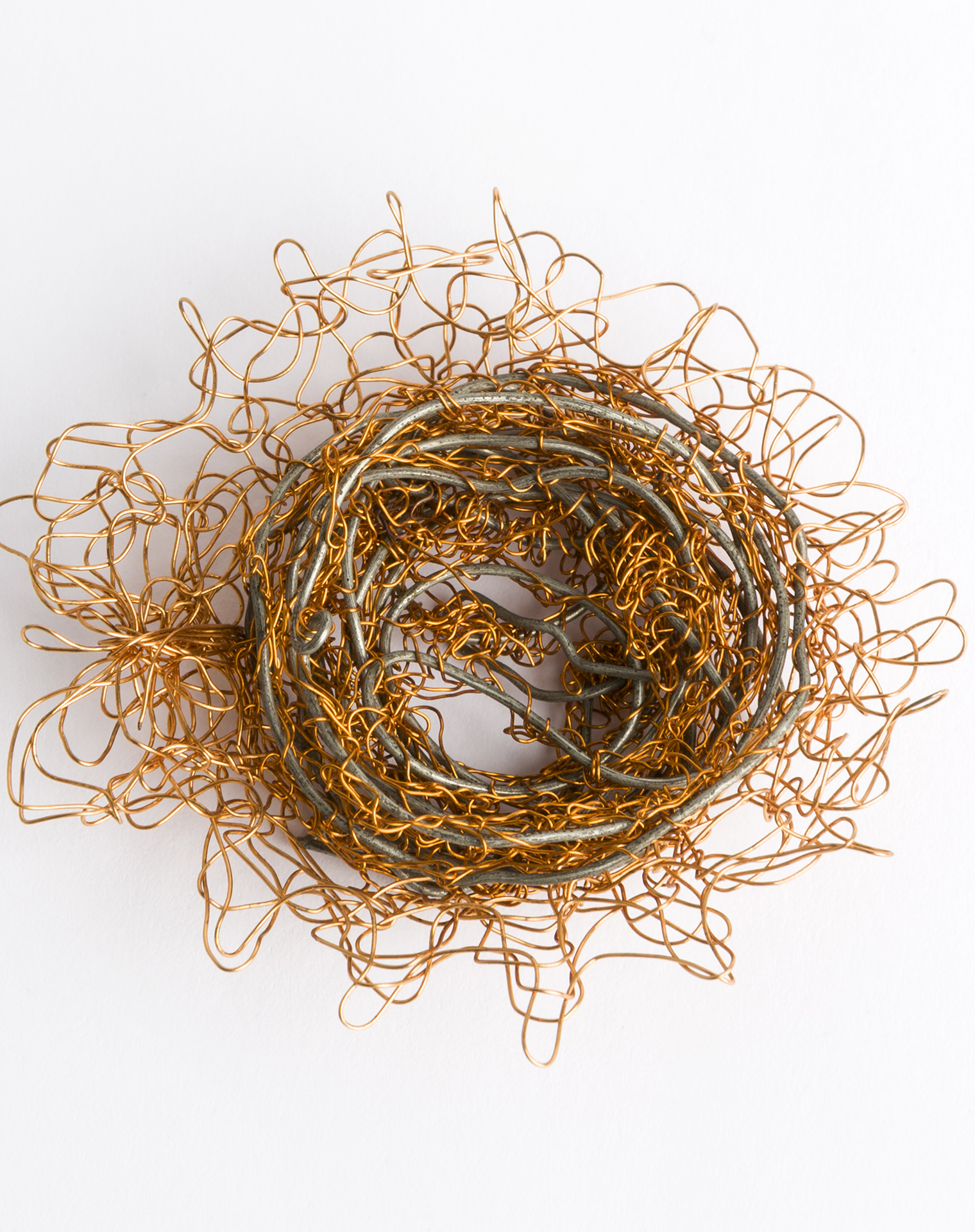 As a young artist, Merz did not receive wide-spread recognition, despite her huge contribution to the scene.[5] Later, the growth of feminism brought her greater consideration. Marisa Merz's art has been described as lyrical, subtle, visionary, and private.[12] Her installations feature the idea of the home as an intimate place, private, and feminine. An example is her 1966 installation Untitled (Living Sculpture), which was intended both for her home and to be presented in a gallery (she once said 'There has never been any division between my life and my work'). The installation consisted of thin strips of aluminium, clipped and suspended from the ceiling, forming coils and spirals. The work was acquired by Tate Modern in 2009. Her practice integrated aspects of craft and practices traditionally associated with women (e.g. knitting) and often employed mundane materials, such as copper, aluminum, waxed paper, and paraffin wax, which reflected her home environment. In this way, her art exemplifies that of the Arte Povera group, which collectively sought to "call into question—if not subvert—the high-gloss finish of fine art and its deadness as an institutional commodity."[13] As an artist, Merz refused to formally name or date her works and claimed that art making operated "beyond time."[14]
