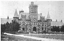 The Administration Building is a three-story structure measuring 112 feet by 56 feet, with a hipped roof. A central square tower which extends to a height of 88 feet, and contains a massive 10-foot wide Syrian entryway arch. The corners of the building contain octagonal bays topped by a pointed spire. Between the octagonal bays and the central tower are two wall dormers which project above the eave line. Round-arch windows are located on each story.[5]