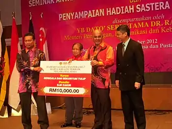 Prizes are awarded every two years for works published during the two previous years. Winners receive diplomas and a bonus of 10,000 Malaysian ringgit.[2]