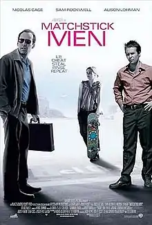 Matchstick Men is a 2003 black comedy film[5] directed by Ridley Scott and based on Eric Garcia's 2002 novel of the same name. The film stars Nicolas Cage, Sam Rockwell, and Alison Lohman. The film premiered on September 2, 2003 at the 60th Venice International Film Festival and was released in the United States on September 12, 2003. It received generally positive reviews and grossed $65 million against its $62 million budget.