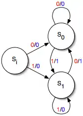 A simple Mealy machine has one input and one output. Each transition edge is labeled with the value of the input (shown in red) and the value of the output (shown in blue). The machine starts in state Si. (In this example, the output is the exclusive-or of the two most-recent input values; thus, the machine implements an edge detector, outputting a 1 every time the input flips and a 0 otherwise.)