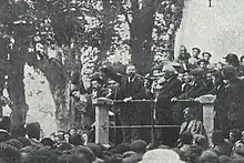 After "La Octubrada", a series of minor Carlist 1900 revolts, Mella sought refuge in Portugal and remained there for a few years,[14] estranged also by the claimant who officially dubbed those involved traitors.[15] Having obtained royal pardon in 1903[16] he resumed parliamentarian career in 1905.[17] As Carlist leaders were usually in their 60s or older,[18] Vázquez de Mella emerged as the most dynamic representative of mid-age generation and most charismatic Carlist politician at all,[19] as a theorist presiding over general overhaul of Carlism.[20] His position consolidated mostly thanks to harangues delivered both in the Cortes and at public gatherings;[21] he did not hold official party positions except in its press tribune, El Correo Español. His personal prestige soon became sort of a problem for both the claimant[22] and the then political leader, Matías Barrio y Mier, appointed to keep the Cerralbistas in check.[23] On orders of Carlos VII Barrio pursued cautious policy of electoral alliances, confronting possibilist vision of malmenorismo-guided coalitions[24] and trying to curb Vázquez de Mella's influence in Correo. As one of his last political decisions in 1909 the claimant appointed a relatively unknown academic, Bartolomé Feliú y Pérez, as successor of the ailing Barrio; the decision came as a blow to supporters of de Mella, considering him obvious candidate for leadership.[25]
