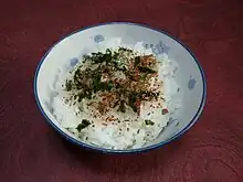 Furikake is a dry Japanese condiment[7] meant to be sprinkled on top of rice. It typically consists of a mixture of dried and ground fish, sesame seeds, chopped seaweed, sugar, salt, and monosodium glutamate. Other flavorful ingredients such as katsuobushi (sometimes indicated on the package as bonito), salmon, shiso, egg, and vegetables are often added to the mix.