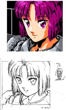 Yoshimiru created his artwork with home television sets in mind versus the professional video monitors used in the office.[5] Before creating pixel art, he would always draw his ideas first. When transferring his ideas into computer graphics, he conveyed his pencil work through careful use of color. He placed medium shades between dark and light shades, effectively a fake anti-aliasing technique.[5] Three assistants helped with converting his pencil drawings to pixel art.[9] Animation was also important to Yoshimiru, so he made sure to add expression and emotion into each scene. The system had limited memory, so he reused animated character portraits throughout the game.[7] These space limitations restricted some of Yoshimiru's artistic vision.[6]