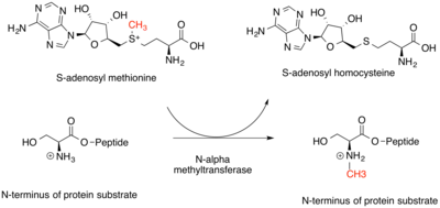 N-alpha methyltransferases transfer a methyl group from SAM to the N-terminal nitrogen on protein targets. The N-terminal methionine is first cleaved by another enzyme and the X-Proline-Lysine consensus sequence is recognized by the methyltransferase. For all known substrates, the X amino acid is Alanine, Serine, or Proline. This reaction yields a methylated protein and SAH. Known targets of these methyltransferases in humans include RCC-1 (a regulator of nuclear transport proteins) and Retinoblastoma protein (a tumor suppressor protein that inhibits excessive cell division). RCC-1 methylation is especially important in mitosis as it coordinates the localization of some nuclear proteins in the absence of the nuclear envelope. When RCC-1 is not methylated, cell division is abnormal following the formation of extra spindle poles.[6] The function of Retinoblastoma protein N-terminal methylation is not known.