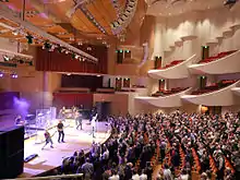 The auditorium ceiling ranges from a height of 44 ft (13 m) above the stage to 62 ft (19 m) at the rear wall. The walls of the stage are covered in a light-colored wood and feature box seats. Suspended above the stage originally were 52 precast concrete "clouds" which helped diffuse sound. In 1990, management added an extensive set of sound diffusers to improve the sound that the musicians heard on stage. These were removed as unsatisfactory after several seasons, and replaced in 2001 as part of a renovation project.[2] The five-year project began in 1997 and also included a new stage lighting system, new stage risers and equipment lift, expanded storage and performer dressing rooms, increased patron washrooms and improved access for patrons with physical disabilities.[1]