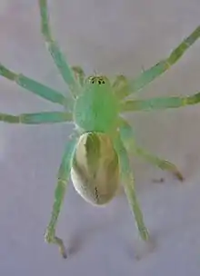 The cephalothorax and the long legs of the females are bright green, with a lighter green abdomen showing a darker green median stripe. The eight eyes are arranged in two rows and surrounded by white hairs.[4] Males are dark green-olive and have a narrower abdomen, with red sides and a red to red-brown median stripe bordered yellow.[8] Young spiders have a yellow-brown cephalothorax, with dark marginal and median stripes. Only after the last molting in the following spring the juveniles assume the typical coloration of the adults.