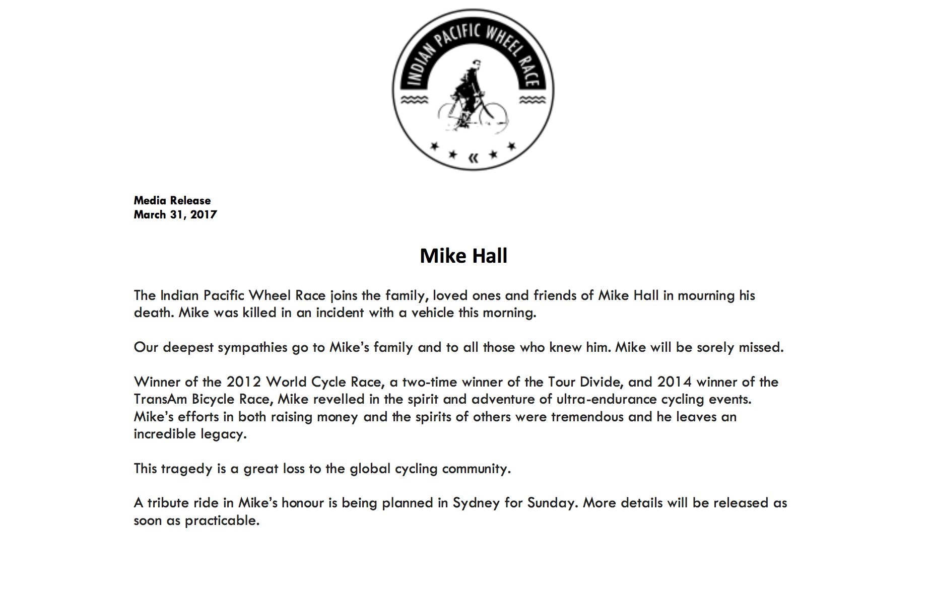 - 1 2 "World ultra-distance cycling champion Mike Hall killed in Indian Pacific Wheel Race". News.com.au. News Corp Australia Network. Retrieved 31 March 2017.