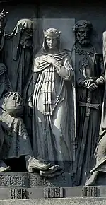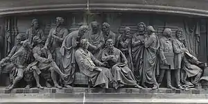 The Millennium of Russia (1862), with Saint Sophia Cathedral in the background. The upper row of figures is cast in the round and the lower one is in relief.