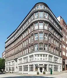 The ground plan of the building adapts to the Schopenstehl and Kattrepel streets, which run at a slightly acute angle. The rounding off of the building towards the street corner was unusual for the time and became stylistically influential for many of the following buildings. The four upper floors were built in clinker brickwork. The two plinth floors are plastered. The house is divided horizontally by several cornices. The figures are by Richard Kuöhl. They represent typical professions on which the Hamburg economy is based.[2]