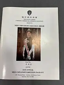 - ↑ "Houston Lodge Chinese American Citizens Alliance 30th Annual Miss Chinatown Houston Pageant Program". 2000.