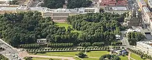 The Mikhailovsky Garden's western side is next to the Church of the Saviour on the Spilled Blood and a degree college named Higher School of Folk Arts[4] (crafts), originally founded by Empress Alexandra, the wife of Russia's last Emperor, and facing a waterway that starts here off Moyka - Griboyedov Canal, across which westwards there is a square formed chiefly by two buildings of the former Royal Mews and named after them together with two adjoining streets Konyushennaya. The carriage house faces the square while the neoclassical stable also runs along the Moyka.