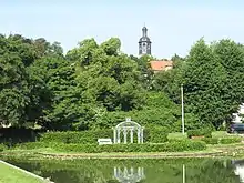 After the war, new residential areas were built, especially in the west and south of the old town centre of Moritzberg. Historic Dingworthstrasse, which was mentioned for the first time in 1728, is still the high street with several shops. Every year a traditional market, the Pflockflötchenmarkt, is held in Bergstrasse on Whit Monday. The name refers to flutes carved from willow branches which were sold there in former times. The art of carving flutes from willow branches is demonstrated by elderly citizens. There is still a Roman Catholic primary school as well as a Protestant primary school. Moritzberg is a much-liked quarter with several historic sights, steep streets, some old, picturesque lanes, a well-kept park around Lake Koenigsteich which was laid out in 1930[5] with a pavilion dating from May 2021 and a forest from where there is a beautiful view of Hildesheim. At present the number of inhabitants amounts to about 15,000.
