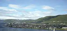 Mosjøen (Norwegian: [ˈmùːʂøːn] ⓘ; Southern Sami: Mussere) is a town in Vefsn Municipality in Nordland county, Norway. Mosjøen is the oldest town in the Helgeland region, with only the town of Bodø being older within Nordland county. The town is also the administrative centre of Vefsn Municipality. The old village of Mosjøen was declared a ladested in 1875. It was also a town municipality (bykommune) from 1875 until 1961 when it was merged into Vefsn, losing its status as a town (ladested). It is also a former garrison town and customs place.[5] In 1998, the urban area of Mosjøen was declared to be a town once again. People from Mosjøen are referred to using the demonym "mosjøværing". The 6.36-square-kilometre (1,570-acre) town has a population (2018) of 9,834 and a population density of 1,528 inhabitants per square kilometre (3,960/sq mi).[2]