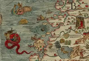 The Moskstraumen was described in the 13th century in the Old Norse poems Edda and remained an attractive subject for painters and writers, including Edgar Allan Poe, Walter Moers, and Jules Verne.[3] The Swedish bishop Olaus Magnus included the Moskstraumen into his detailed report on the Nordic countries and their map, Carta Marina (1539). He attributed the whirlpool to divine forces and mentioned that it was much stronger than the previously known Sicilian whirlpool Charybdis. Most other writers of the time believed that the Moskstraumen played an important role in the ocean circulation, but, given a large number of tales and lack of scientific observations, grossly overestimated the size and power of the phenomenon.[5] The Moskstraum, referred to simply as the Maelstrom, was the inspiration for Poe's short story "A Descent into the Maelström" (1841), which brought the term maelstrom, meaning strong whirlpool, into the English language.[11] The Moskstraumen also features in the climax of Jules Verne's Twenty Thousand Leagues Under the Sea and is mentioned by Captain Ahab in Herman Melville's Moby-Dick.[12] A likely source of information on Moskstraumen for those writers was a fictional description of the Moskstraumen by Jonas Danilssønn Ramus from 1715 which was translated into English and partly included into the 1823 edition of Encyclopædia Britannica.[5] Poe quoted Jonas Ramus and Encyclopædia Britannica in his tale.[4] The Moskstraumen is visited by characters in Liu Cixin's Death's End.[13]