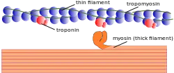 Myofilaments are the three protein filaments of myofibrils in muscle cells. The main proteins involved are myosin, actin, and titin. Myosin and actin are the contractile proteins and titin is an elastic protein. The myofilaments act together in muscle contraction, and in order of size are a thick one of mostly myosin, a thin one of mostly actin, and a very thin one of mostly titin.[1][2]