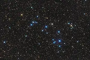 NGC 6633 is a large bright open cluster in the constellation Ophiuchus. Discovered in 1745-46 by Philippe Loys de Chéseaux, it was independently rediscovered by Caroline Herschel in 1783 and included in her brother William's catalog as H VIII.72.[1] Bright enough to be seen with the naked eye, the cluster is considered a fine object for binoculars or small telescopes.[2]