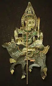 Nang talung (Thai: หนังตะลุง, pronounced [nǎŋ tā.lūŋ]) is a traditional style of shadow puppetry from southern Thailand.[1] Similar arts are found in Cambodia, Malaysia, and Indonesia.[2][3][4] Nang means "leather" ("leather puppet" in this case), and talung is an abbreviation of Pattalung, a southern city where the shadow play tradition has long been popular. Nang yai features life-size puppets, while nang talung puppets are much smaller.[5]