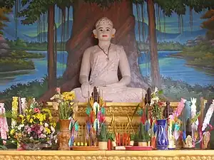 Christians in Cambodia consider the neak ta as a form of idolatry.[58] Ethnologists have seen striking similarities between the discourse of the neak ta Yeay Tep or "ancestral goddess" who wants to "come and save humanity" with the discourse of missionaries concerning the Virgin Mary.[59] In fact, the miraculous discovery in 2008 of a statue of the Virgin Mary which had been thrown into the river by the Khmer Rouges has developed a local devotion to the Virgin Mary in Areyksat.