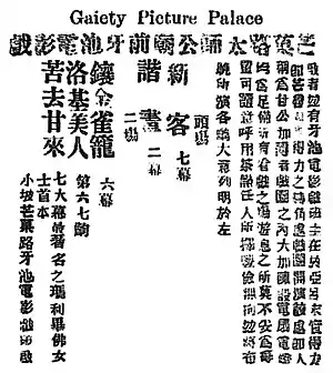 The silent film New Friend (新客) is a melodrama about a newly arrived Chinese immigrant to Singapore. It was first screened in Singapore at the Victoria Theatre (維多利亞戲院) on 4 March for a public test,[2] entertained more than 500 guests, just showed 6 reels of film, two erotic dances (Chinese sword dance and Malay butterfly dancer) were also shown in the showed film.[3] Its official premiere was at Marlborough Pub and Theatre (曼舞羅戲院) on Beach Road (小坡海墘十二間), and Gaiety Picture Place (牙池電影戲), the cinema was located in front of a Chinese temple - "(太師公廟)", the junction between Albert Street (芒果律) and Bencoolen Street (小坡五馬路), Singapore. After public showing in Singapore, it was reported that it used another Chinese film title as "(唐山來客)", released in the "Chung Wo Cinema (中和影畫場)" in Kau U Fong (九如坊), Hong Kong, from 29 April 1927, Friday to 2 May 1927, Monday, totally four days, so it is the first film production of Singapore, and the first export film production too.[4]
